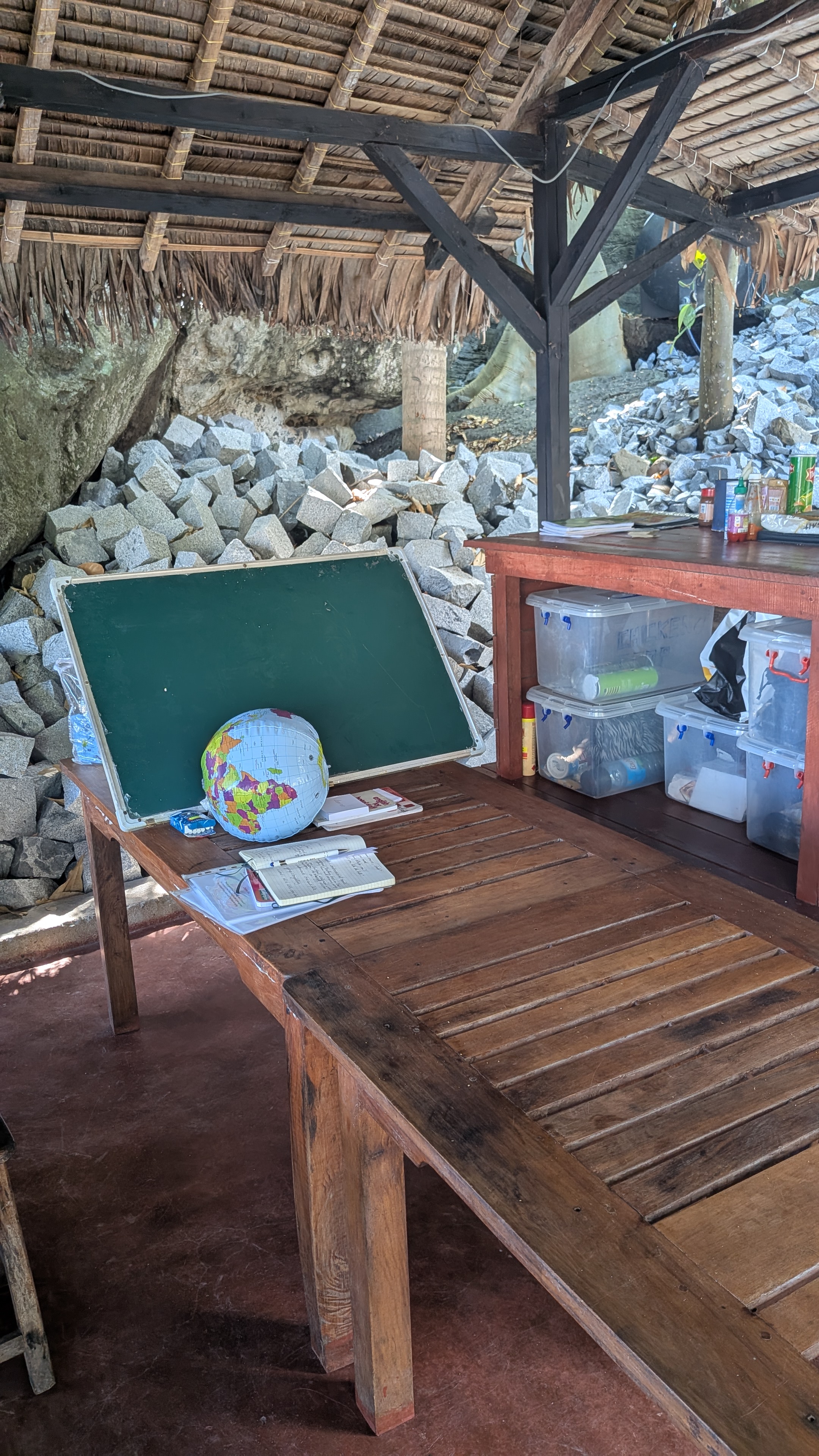 When assigned to teach at university: I think “wow”, ride the boat to Hell-ville, Nosy Be, get picked up by a Tuc Tuc and meet my students in a building that belongs to the university. Just in case, I bring my chalk and sponge along. My inflatable globe is my best all-round working tool … These students have a working basis in English, but they too need to practise their speaking skills. They enjoy the exercises and, like all the others, love to sing a song at the end … and they say “thank you”. (come to think of it, the others did, too)